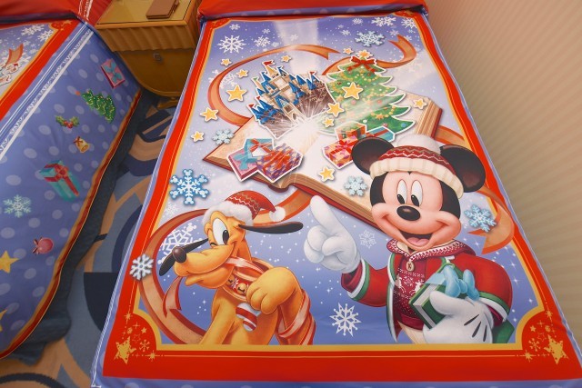 各ベッドにはミッキーとプルートのベッドスプレッドと