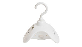 部屋干しくるくるカラりんは、自動で回転する充電式のハンガー。本体の穴に、シャツハンガーやピンチハンガーなどを掛けて、ハンガーラックなどに吊るせば、毎分6回転のスピードでハンガーがぐるぐると回転する。部屋干し時に洗濯物の内部に空気が滞留することによって起こる、洗濯物の乾きムラ、色あせ、雑菌、生乾き臭を防ぎ、通常の乾燥よりも早く乾かすことができる。