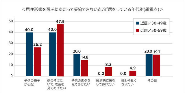 30~49歳の親視点では「子供の様子が心配」「孫の側にいて、成長を見たい」とう点が共に40%と多く、50~69歳では「孫の側にいて、成長を見たい」が最多となりました。