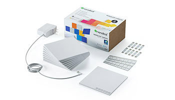 「Nanoleaf Canvas Smarter Kit」は、四角いLEDパネル8枚と、最大500枚のLEDパネルを操作できるコントローラーパネルが付属。連結したLEDパネルは、付属の両面テープを使って壁や天井などに簡単に取り付けられる。