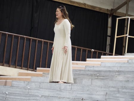この日は、6月6日(木)・9日(日)公演キャストによる通し稽古だったが、圧倒的存在感を放ったのが、サロメ役の田崎尚美だ。全編出ずっぱりの彼女は、ヨカナーンとの出会いで生まれた愛情から狂気に至る心情を見事に演じていた。激情が溢れ出す絶唱から一転、冷静にただ状況を見つめる表情、妖艶な〈7つのヴェールの踊り〉など、ひと時も目を離せない。クライマックスの凄唱は、ぜひとも劇場で体感してもらいたい。萩原潤、片寄純也、清水華澄らも好演。