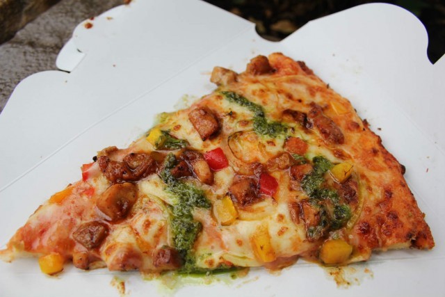 ピザ全体の長さは20センチ弱、生地も薄めではありますが、豊富な具材やチーズが見た目以上にしっかりおなかにたまります。