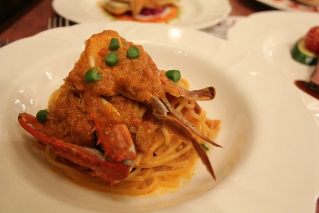 通常のスパゲッティーよりやや細めのパスタである「スパゲッティーニ」を、香ばしい蟹とトマトで味付けされたクリームソースでいただくこのメニュー。
