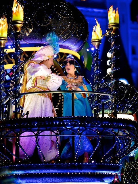 まるで宮殿のようなフロートで登場するアラジンとジャスミン