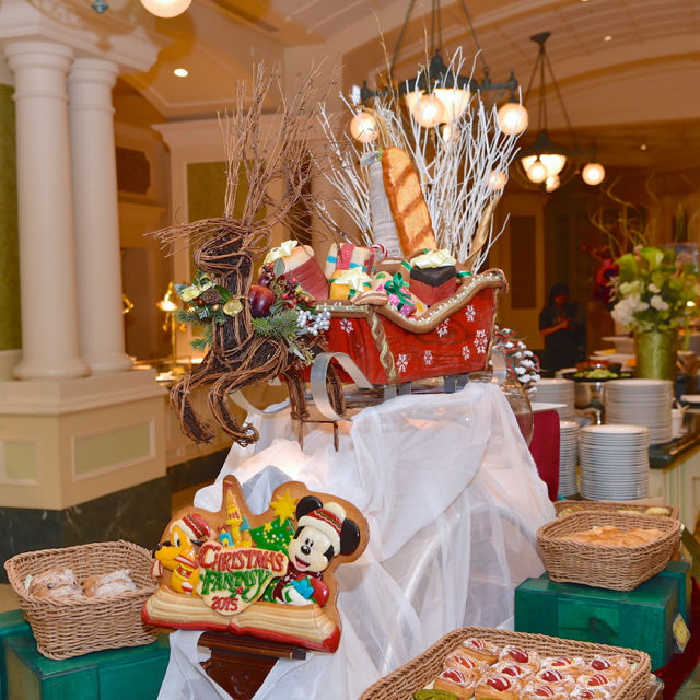 「クリスマス・ファンタジー」のミッキー&プルートのパンや、トナカイとソリなどクリスマスならではの飾り付けに食事の前から気持ちが盛り上がります!