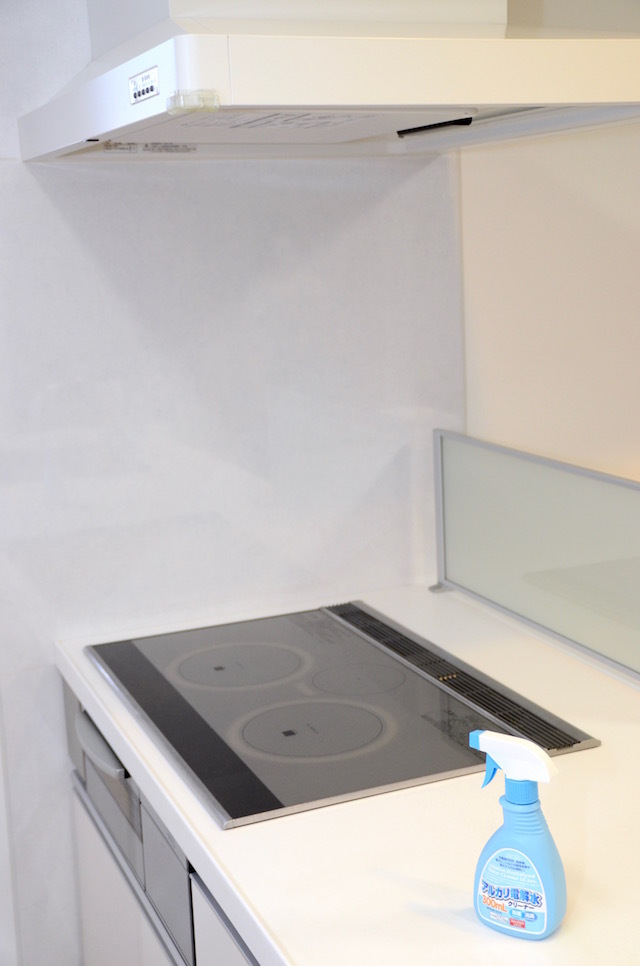 周囲の油はねなども、アルカリ電解水クリーナーで綺麗にして、換気扇、調理器周りのお掃除は完了です。スッキリ。