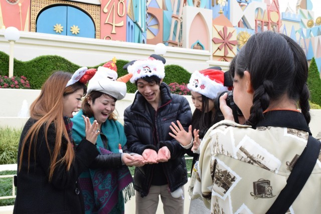 定番の大きなクリスマスツリーやシンデレラ城だけでなく、レストランの裏庭や道端の花壇、多くのゲストで賑わう道の真ん中で撮影を行います。