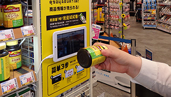 タブレット端末の「Payke Tablet」は、薬や化粧品棚のエンドに設置されている。使い方は簡単だ。商品のバーコードを端末に読み込ませると、米国、英国、中国、台湾、香港、韓国、タイ、ベトナム、日本のアイコンを表示。自分の国を選択すると、商品に記載している詳細が翻訳して表示される。