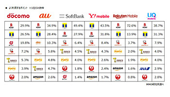 男女6000人のうち、ポイントサービスを利用していると回答した5826人に、対象に、最も利用するポイントサービスの順位を聞いたところ、ドコモ、au、、楽天モバイル、UQ mobileのユーザーが「楽天スーパーポイント」、ソフトバンクとY!mobileのユーザーが「Tポイント」と回答したという。
