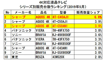 2018年12月1日に新4K衛星放送がスタートし、本格的に4K映像の時代がやってきた。全国の家電量販店・ネットショップのPOSデータを集計する「BCNランキング」によると、5月に最も売れた4K対応液晶テレビはシャープ「AQUOS 4K(4T-C40AJ1)」だった。ランキングでも、TOP3はシャープの独占状態だ。
