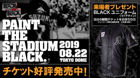 東京ドームでプレーボールを迎えるロッテ×楽天は8月22日(木)開催。この日はロッテの選手たちがビジターユニフォームを着用して、試合に臨む。さらにマリーンズの象徴であるピンストライプを黒く染めたBLACKユニフォーム('47デザイン)を来場者にプレゼント(ビジター外野応援指定席を除く)。真夏の東京ドームを黒く染め上げたい。