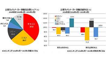 トップシェアのキヤノンは、販売台数が98.7%とわずかな前年割れで踏みとどまった。しかし、販売金額で88.6%と2桁割れを喫している。18年12月期の決算でも、映像セクターの売上高が前期比で88.7%とふるわなかった。「EOS Kiss M」で、一眼レフから本格的にミラーレスにシフトし、「EOS R」「EOS RP」でフルサイズミラーレス一眼市場にも華々しく参入したものの、蓋を開けてみれば行って来いでマイナスという結果に終わっている。