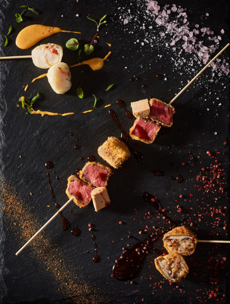 メインは「牛フィレ肉のロッシーニ」「ロブスターのベニエ」「茸のアランチーニ」の3種のフレンチ串。豪華食材を使用したフランス料理が、ビールに合わせて食べやすい一口サイズの串料理に仕上げられています。