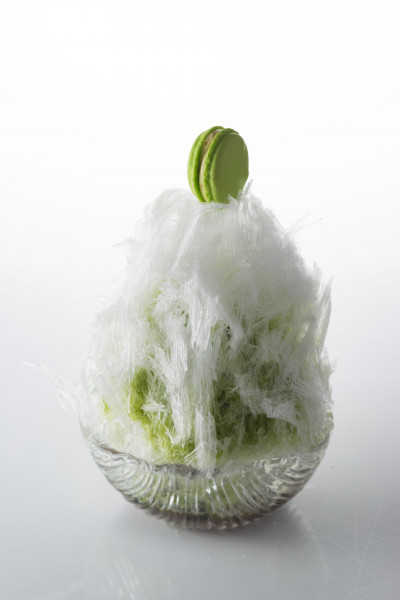 ブランマンジェとフレッシュなライチを氷の下に敷き詰めた、本格スイーツさながらの味わいが楽しめる今年の新作かき氷です。ライチソースとマスカルポーネチーズクリームを贅沢に使用。仕上げにはバラ香る「レッドローズマカロン」をトッピング。隠し味のライチはちみつが上品な味わいを引き立てています。