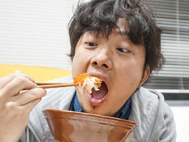 うますぎるので、会社の同僚にも食べてもらいます。ウニとイクラを食べる原宿さん。