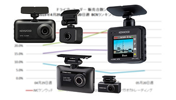 5月の各週のメーカー別販売台数シェアでは、JVCケンウッドとコムテックが競り合う展開となった。前半こそJVCが優位に立ったが、コムテックが3週以降は猛追。シェア30%前後でもみ合っている状況だ。同期間のシリーズ別販売台数シェアでは、JVCケンウッドの「DRV-340」が11.9%のシェアで1位を獲得。フルHDの高精細な液晶ディスプレイや自車位置情報を測るGPS機能など、基本をしっかり押さえながら購入しやすい価格帯であることが人気につながった。