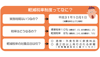酒類・外食を除く飲食料品と週2回以上発行される新聞を対象とした軽減税率制度は、消費税率の10%への引き上げと同時に実施する。軽減税率は8%。一般消費者はもちろん、全ての事業者に関係するため、広く周知している。チラシ・パンフレット、詳細な資料などは国税庁や関連省庁のWebサイトで確認できる。