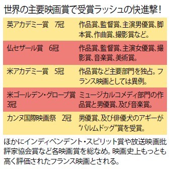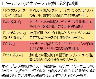 『アーティスト』の舞台は、サイレントからトーキーへと移り変わる'30年前後のハリウッド。サイレント映画が消えていった変革期を敢えてサイレントで描く︱︱という構成は、趣向として面白いというだけでなく、フィルムからデジタルへと移行する現代の映画界まで想起させて興味深い。また監督のミシェル・アザナヴィシウスが300本を超えるサイレント映画を研究したというだけあって、古き良き名作たちへのオマージュが随所に盛り込まれており、ピュアな〝映画愛〟に満ちていることもさまざまな映画賞を席巻した要因のひとつだろう。
