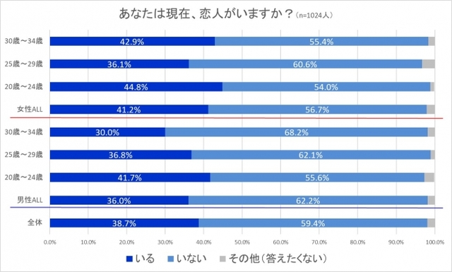 20歳~34歳の独身男女1024名を対象に「あなたは現在、恋人がいますか?」と質問をしたところ、全体の59.4%が「いない」と回答。