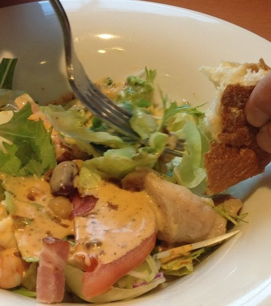 ――さあ、食べましょう。サラダって、けっこう取るのが難しい。