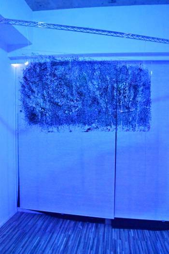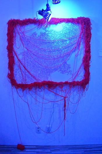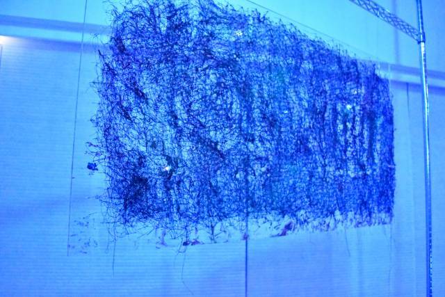 「たくさんの赤い糸が複雑に絡み合うこの絵は、外の光や普通のライトでは何も変わりませんが、青いライトでは色が潰れて黒く見えます。
