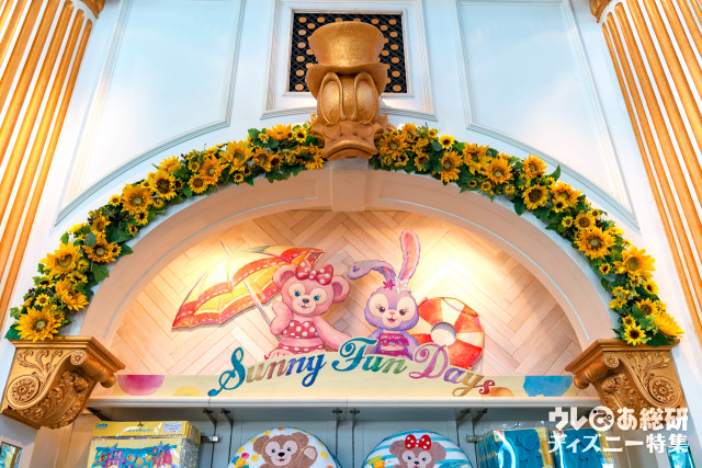 期間限定のグッズの上には、水着姿のダッフィーたちの絵とひまわりがたくさん!