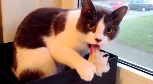 真面目な表情と、ベローンと伸びてしまった舌とのギャップがジワジワと来る、静かな笑いを誘う猫動画となっております。