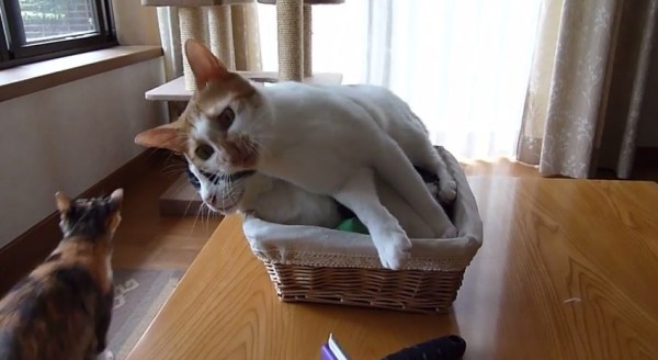 動画開始10秒ほどで、先客の黒白猫へ折り重なるように、カゴのすき間をみっちりと埋めております。そして斜め45度の傾きと、先客との友好も保ちつつ寝そべる茶白猫。