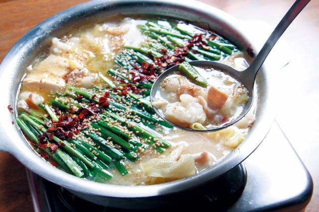 もつをスパイシーに味付けたっぷりのねぎをトッピング。コンロで熱々を提供する。