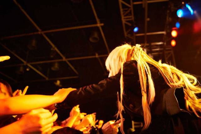 千秋がステージに登場し、「『眩暈』」が始まるとステージ後ろのライト群が派手に点滅する。そして一気にフロアがヘドバンの海に化ける。その海から時折キメのタイミングでスッと伸びる数々の腕。これが、DEZERTのライブの光景だ。