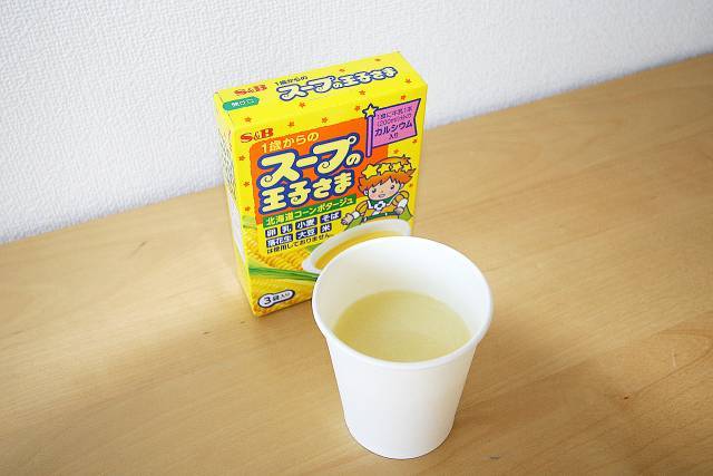 コーンスープの飲み比べが済んだ後、なおもコーンスープをチェックしていたら、ちょっと珍しい商品に出会いました。その名は「スープの王子さま」。「カレーの王子さま」と同じ、エスビー製の子ども向けコーンスープです。1歳から飲むことができ、卵、乳、小麦といった、アレルギーの可能性がある素材は使用していないそうです。
