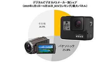 2019年のデジタルビデオカメラ市場は、パナソニックとソニーの接戦の中で折り返しを迎えそうだ。全国の家電量販店やECショップからPOSデータを集計する「BCNランキング」によると、19年1月1日~6月16日までのデジタルビデオカメラ販売台数シェアで首位に立っているのはソニーで、シェアが26.0%。2位のパナソニックとの差は0.2ポイントと、接戦を繰り広げている。