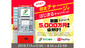 PayPayは、セブン銀行と提携し、2019年7月11日午前10時から、現金による「PayPay」への現金チャージに対応する。 セブン-イレブンの店舗内をはじめ、全国2万5000台以上ある「セブン銀行ATM」で、取引用QRコードをPayPayアプリで読み取って、原則24時間365日、現金から1000円単位でチャージできる。入金手数料は無料。1回当たりの入金限度額は50万円となる。なお、PayPayのアカウント保有残高上限額は100万円となっており、上限額以上の金額をチャージすることができない。