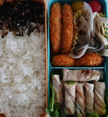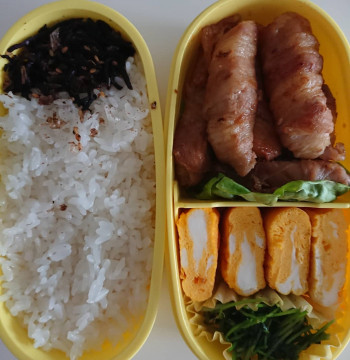 さとっち「中学生男子はポテトの肉巻き。体育大会当日のお弁当でした。ボリュームがある弁当にしたいと思い、ポテトを豚バラで巻いて焼き肉のたれをかけて作りました。」
