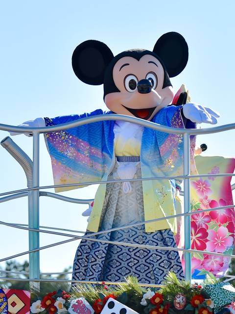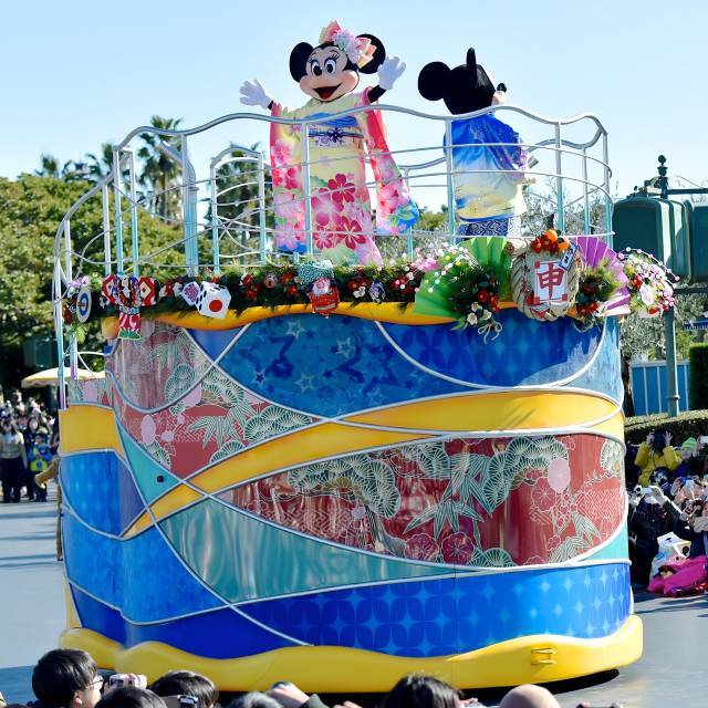 ミッキーマウスやミニーマウスはお正月ならではの飾り付けが施されたフロートで登場します。