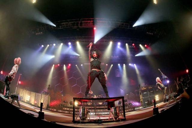 開演時間になると、SE「猛毒」とともに車いすに乗ったメト(Dr)が登場。立ち上がり「待ってました」と言わんばかりにフロアを威嚇します。拡声器のサイレンを鳴り響かせながら下手後方のセットから恋一が現れ、つづいてMiAが登場。そして最後に綴(Vo)が腕を組み、堂々とした振る舞いでステージ中央へ。
