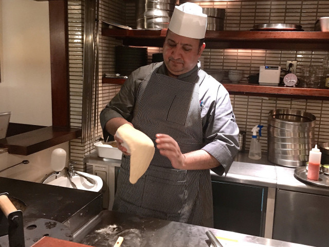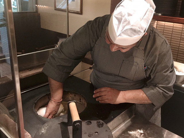 インド人シェフと思しき人が、手でととのえたナンの生地をタンドール窯に入れた。立ち上がれば、タンドール窯の中もよく見える。