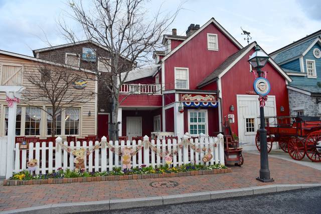 白い大きな建物の、ショー「マイ・フレンド・ダッフィー」も見られるレストラン「ケープコッド・クックオフ」の隣にある、赤い建物が、「ケープコッド・コンフェクション」になります。