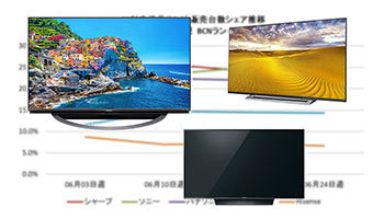 週次のメーカー別販売台数シェアでは、6月3日週はシャープが2位に6.2ポイント差でトップを維持したものの、徐々に差が縮まり、6月17日週にソニーが逆転。翌6月24日週にはシャープが抜き返した。パナソニックも安定して20%を超えるシェアを獲得するなど、3社が僅差で競り合った。