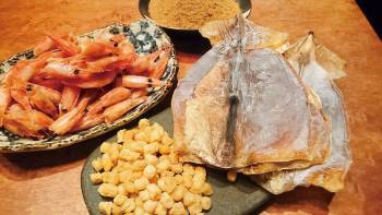 干し貝柱、スルメイカ、甘エビの頭などから濃い目のダシを抽出。