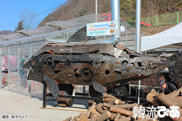 ヤマメを焼く機械もヤマメ形。なんにでも落書きをしがちな韓国人の手にかかり、このヤマメも、なぜか「サランヘヨ♡」などの落書きだらけでした。