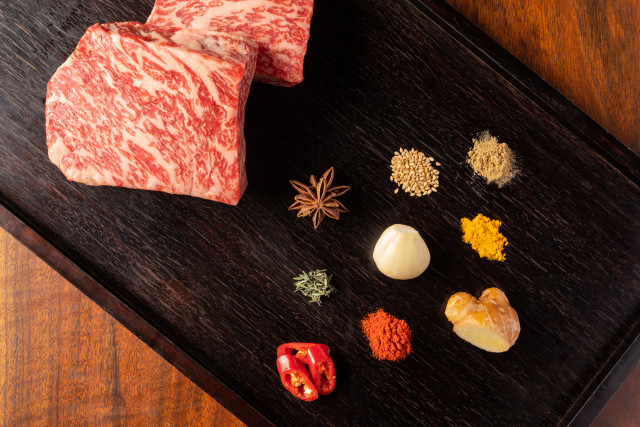 タイム、ショウガ、ゴマ、トウガラシ、スターアニス、カルダモン、ターメリック、ガーリック、韓国トウガラシの9種類のスパイスに丸一日漬け込んだ、ピリッとした辛みのあるサーロインステーキです。