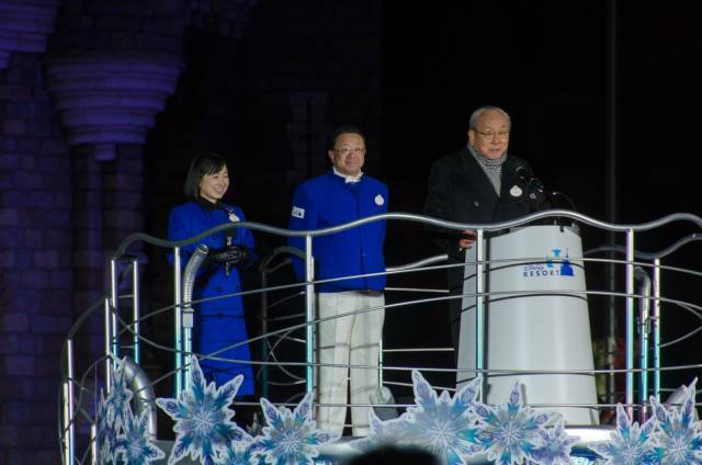 大変風が強く、お二人とも上手く呂律が回らないほどの寒さでしたが、それぞれの言葉で「東京ディズニーリゾート最大の魅力はキャストの笑顔」(上西社長)、「東京ディズニーリゾートに命を吹き込むのがキャスト」(加賀見会長)と激励。