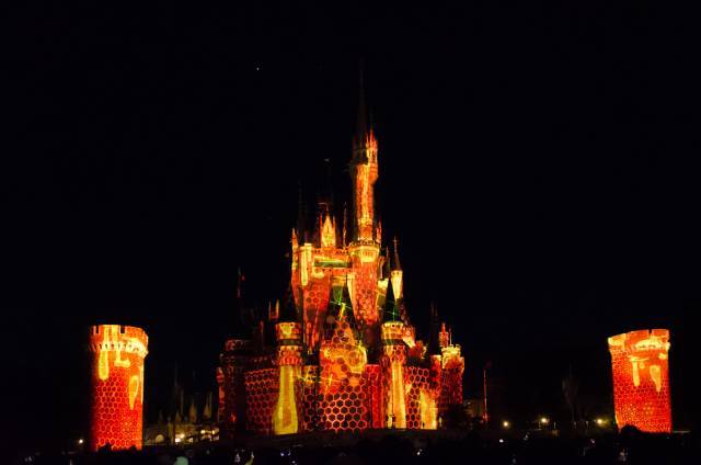 ふしぎの国のアリス、くまのプーさん、美女と野獣、シンデレラといった、ワンス・アポン・ア・タイムに登場する映画のワンシーンがシンデレラ城に次々と映し出されていきます。