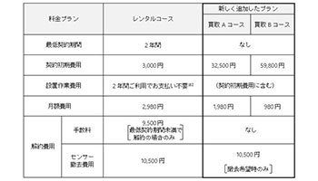 今回追加した「買取Aコース」「買取Bコース」では、サービス利用時に設置が必要なエネルギーセンサーを、従来のレンタルではなく買い取ることで、税別月額料金を2980円から980円に抑えられる。レンタルコースでは必要な設置作業費用や、解約料も発生しない。
