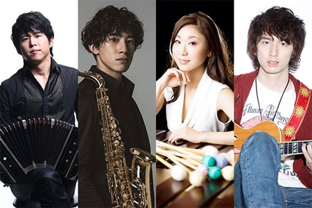 左から三浦一馬(バンドネオン)、上野耕平(サクソフォン)、塚越慎子(マリンバ)、井上銘(ギター)