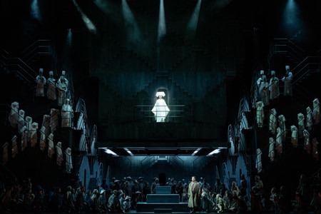 演出に起用されたのはアレックス・オリエ。1992年バルセロナ五輪開会式の演出を手がけた演出家で、今回のプロジェクトとは「五輪つながり」ということにもなる。舞台装置は壮観だ。天井までそそり立つ壁。その壁に張り付くように無数に巡らされた階段。オリエによれば、舞台全体は、権力構造の象徴であるピラミッドを逆さにしたもの。舞台面が、すり鉢の底というわけだ。やがて、その底に這いつくばる民衆を押しつぶすかのように、巨大な舞台に乗った最高権力者トゥーランドット姫が、神のように降りてくる。オリエは今回の造形イメージのヒントを得たものとして、ブラジル人写真家セバスチャン・サルガドの、露天掘り金鉱山の写真や、有名な「エッシャーのだまし絵」の階段、退廃的な近未来を描いた映画『ブレードランナー』などを挙げていた。なるほど、その感じ、わかる。