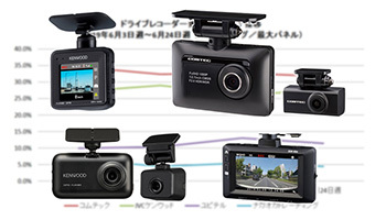 全国の家電量販店やECショップでPOSデータを集計する「BCNランキング」によると、6月のドライブレコーダーの販売台数は前年同月比で107.8%と伸長した。メーカー別では、ツートップのコムテックとJVCケンウッドに人気が集中。コムテックが前年同月比113.4%、JVCケンウッドが174.1%と、大きく成長している。