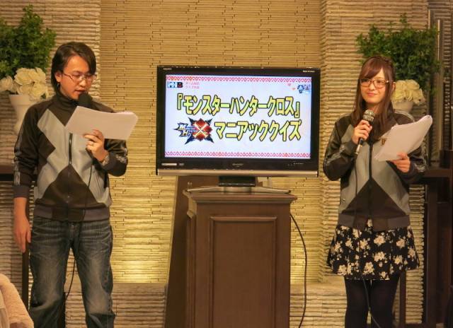 続いてはチーム対抗のクイズ大会。司会はモンハン部モテヤマ部長と、モンハン部マネージャーの佳村はるかさん。非売品のジャージがキュートです。『モンスターハンター クロス』のマニアックな問題が出題され、グループで協力しあって、答えを導き出すというものですが、これがなかなか難しい!
