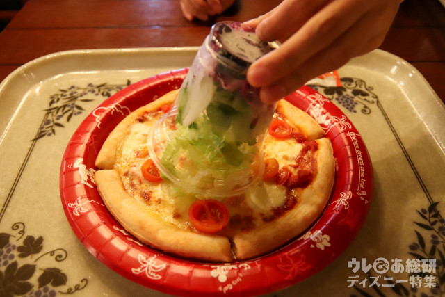 ピザ自体はチーズにトマトが乗ったシンプルなものですが、別添えのサラダをかけることで大変身します!